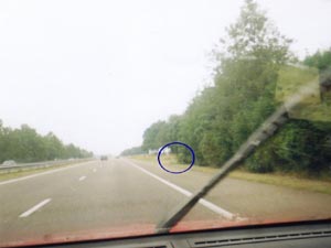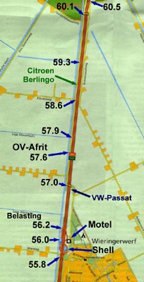 ![]() | Daarna ben ik op de parallelweg doorgereden naar Den Oever en ben daar (twee uur later) weer de A7 opgegaan (Ik moest toch nog naar Utrecht toe). Tijdens deze rit heer heen, heb ik rijdend nog enkele foto's gemaakt. Zo was te zien hoe verdekt de Citroen-Berlingo opgesteld stond in de berm achter het struikgewas. |