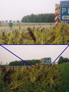![]() | Bij de eerstvolgende afrit (Wieringerwerf) ben ik de A7 afgegaan. In het dorp heb ik nog een nieuw foto-rolletje gekocht, waarna ik via de parallelweg teruggereden ben. Net na het motel was een open stuk in de begroeiing, alwaar ik keurig nog een foto kon maken van de controle-parkeerplaats. Bij eerder genoemd viaduct [HMP57.0] ontdekte ik de Volkswagen-Passat pas. Op het viaduct heb ik ook nog een groep motor-rijders kunnen waarschuwen voor deze wagen. |