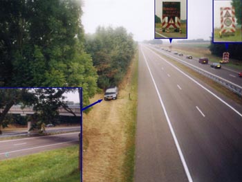 ![]() | Vandaag stonden ze er dus wel. Al van verre was een ongewoon matrix-bord te zien, waardoor ik enigzins argwanent mijn gas terug hield op zoek naar ongewone voertuigen in de berm. Toen ik verderop nog meer oplichtende matrix-borden zag, was het voor mij tijd om alarm-lichten aan te doen en nog verder snelheid te verminderen. |