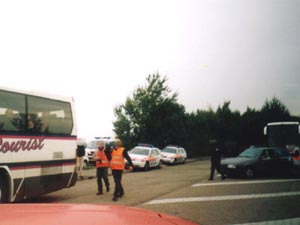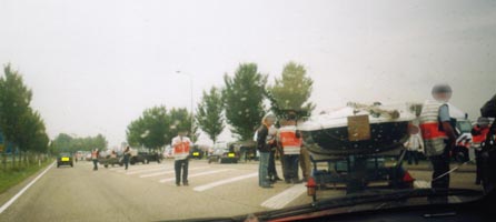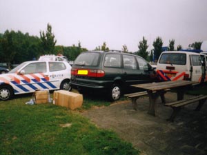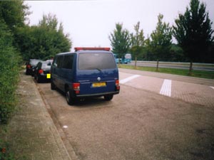 ![]() | Ik kreeg twee juffrouwen bij mijn wagen. Voordat ik mijn papieren liet zien, heb ik een verklaring gevraagd over wat ze daar deden. Deze kreeg ik niet op papier (dit in tegenstelling tot 25 mei 2002). Dit vond ik een min-puntje, aangezien er zo geen "bewijsje" was van de spontaan opgedrongen vertraging. Ondertussen zag ik er ook iemand met een video camera lopen. De pers? Politie-opnames? |